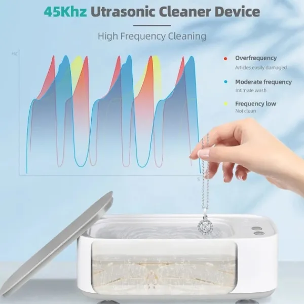 Djuprengöring: Denna ultraljudstvätt använder 45 kHz ultraljud för att uppnå 360° allsidig djuprengöring. Ultraljudsvibrationerna orsakar kavitation i vattnet och bildar otaliga små bubblor. Den snabba sprängningen av dessa bubblor genererar ett omedelbart högt tryck, som innehåller enorm energi som gör att smuts sätter sig på ytan av föremål, vilket ger en grundlig men icke-destruktiv rengöring.