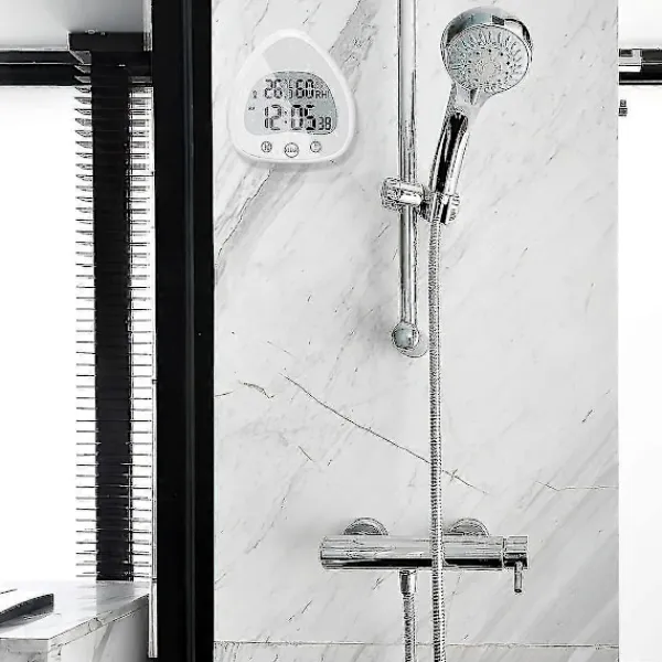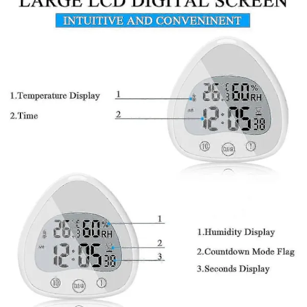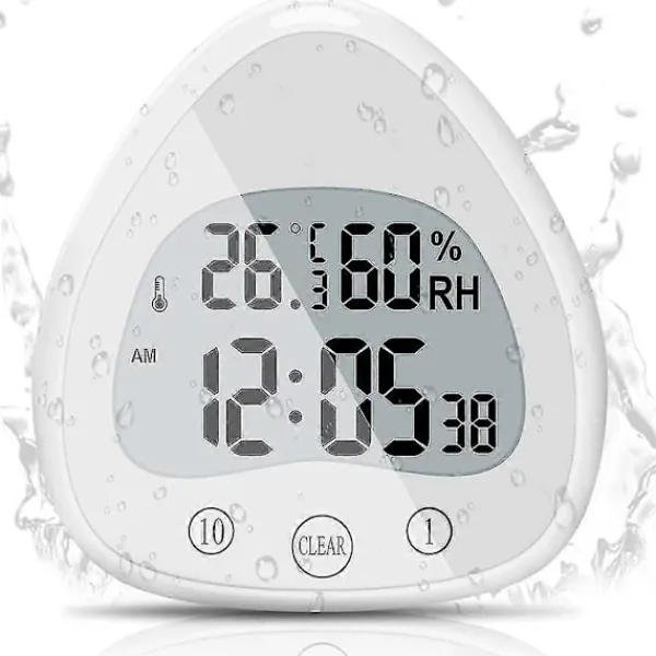 4 i 1 LCD Digital Klocka Det vattentåliga uret har flera funktioner som att visa tid, tidtagning, temperatur och luftfuktighet. Den kan växla mellan tre visningssidor av en 24-timmars/12-timmars klocka, klocka och nedräkning, C/F Celsius och Fahrenheit termometer. Den nya stora LCD-skärmen har en bredare syn, ger bättre visuella effekter än andra duschtimrar och hjälper dig att läsa tiden lättare.Vattentät Touchskärm Den digitala duschtimmern har en hint IP24 vattentät klassificering, ingen rädsla för stänk i alla riktningar, för att säkerställa att ingen vattendimma eller vatten sipprar in i badrumstimmern (var försiktig med att undvika ångbastuområdet). Ytan använder touchknappar, som är känsliga och snabba att justera nedräkningen.Flera installationsmetoder Baksidan av badrumstimmern har ett starkt dubbelsugkoppslager, som kan fästas på släta väggar som glas och ogrynnade plattor. Dessutom har den visuella nedräkningstimmern ett fäste och ett hål för väggen och installationen, så timmern kan placeras på sminkbordet, skrivbordet, bordet eller hängas på en ren vägg för att möta dina olika behov.Lätt att ställa in timern Detta är både en väckarklocka och en vattentät duschtimer. Du kan trycka på 10 och 1 för att gå in i nedräkning och CLEAR för att avsluta nedräkningsläget. Dessutom kan den digitala duschtiden i badrummet överlagras upp till 99 minuter, och höga och tydliga påminnelser kan också höras i angränsande rum. Det är en idealisk hjälpare för tidsstyrning.En bra hjälpare i livet Timern kan också vara en klocka. Det är ett utmärkt val för daglig tid, temperatur och luftfuktighet, och nedräkningsvisning. Den är lämplig för platser där tid behöver sparas, som bad och badrumsavlopp, kök, avslappnande spa, tvättstuga, etc. (2 AAA-batterier krävs, ingår inte).Funktioner:1. Utseendet på badrumsnedräkningen är i form av en droppe, med ett enkelt utseende och stark tillämplighet. Det är det perfekta verktyget och den bästa dekorationen för oss att registrera och hantera tid.2. Framsidan av kökstimmern är för snabb timerfunktionsdrift. Enligt prompten, skruva loss bakstycket på baksidan för att se det dolda batterifacket och kontrollknapparna.3. Det maximala mätbara luftfuktighetsintervallet är 99%. När det överstiger det mätbara intervallet visas inchHHinch och visas enligt den aktuella luftfuktigheten och temperaturförändringarna.4. Duschtimmern är batteridriven och behöver inte anslutas till ett uttag, så du kan placera och flytta den var du än behöver den. Förbered 2 AAA-batterier före användning.5. Temperatur- och luftfuktighetstimmern räknar ner exakt, är utformad snabbt och visas på en stor skärm. Fet skrift gör det mer bekvämt för personer i olika åldrar.Specifikationer:Produktstorlek: 10,9 x 5 x 11,2 cm/4,29 x 1,96 x 4,4 tumMaterial: PlastFärg: VitStrömförsörjning: 2 x AAA-batterier (ingår inte)Paketlista:1 x Duschtimrar