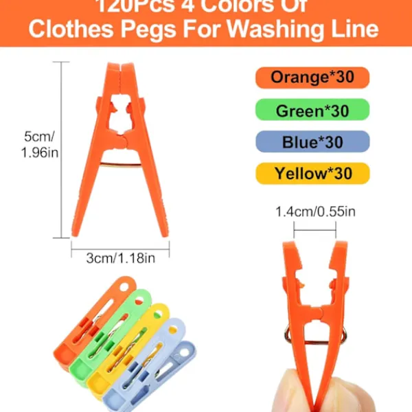 【120 st Tvättklämmor i 4 färger】Klädnypor för torklina starka finns i orange, gult, grönt och blått, totalt fyra färger, med 30 klämmor av varje färg, vilket ger totalt 120 klämmor för vardagligt bruk.