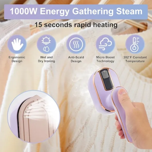 【15s Snabb Uppvärmning】Det lilla ångstrykjärnet för kläder har 1000 watt effekt, vilket gör att det kan värmas upp snabbt på 15 sekunder till 302℉ konstant temperaturstrykning. Mycket snabbare än traditionella ångstrykjärn, vilket gör att kläderna blir som nya på nolltid. Den keramiska titanbelagda stryksulan på det lilla ångstrykjärnet är mycket robust, leder värme snabbt och jämnt, säkerställer smidig glidning på tyget, tar effektivt bort veck och skyddar dina kläder bättre.