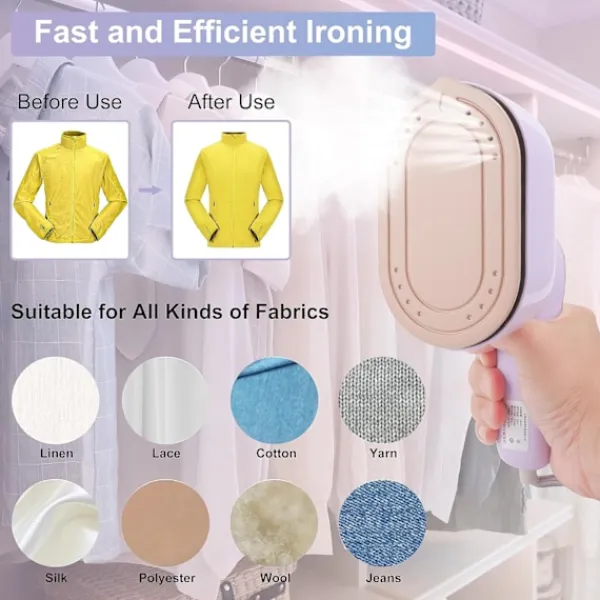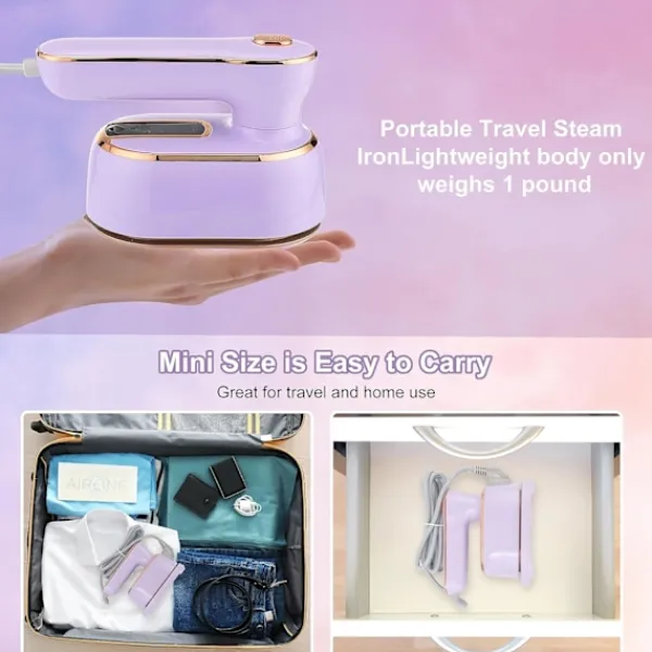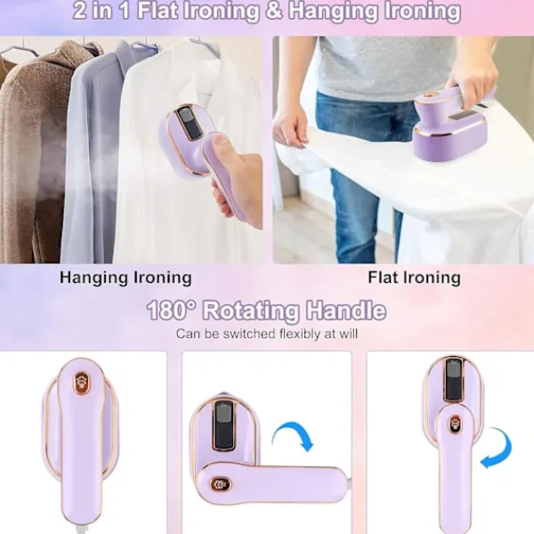 【Bärbar Ångstrykjärn Resestorlek】Den hopfällbara handtagsdesignen på det bärbara ångstrykjärnet för kläder ger bekvämlighet för förvaring, 180° flexibel växling för platt strykning och hängande strykning. Kroppen är mycket liten och lätt, väger bara 1 pund, den kan läggas i en handväska. Denna resesteamer är lämplig för alla typer av tyger, och du kan ta med den på semester eller resa, och stryka när som helst, var som helst.