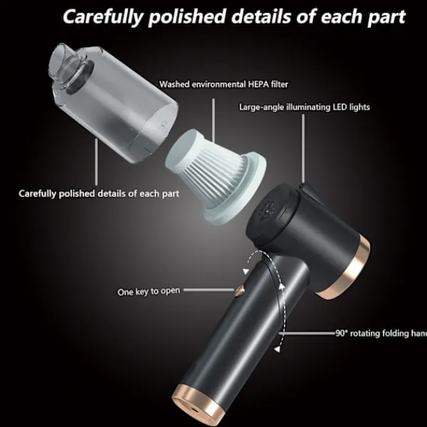 Lätt och 90° vikbar design. Tesla-dammsugaren väger bara 0,76 pund, både äldre och unga kan greppa och kontrollera och kommer inte att orsaka trötthet i händer eller armar när du städar. Vakuumet antar 90 graders rotation och kan placeras slumpmässigt i bilens inre utrymme. Lysdioden är upplyst i en stor vinkel för att lysa upp varje mörkt hörn.
