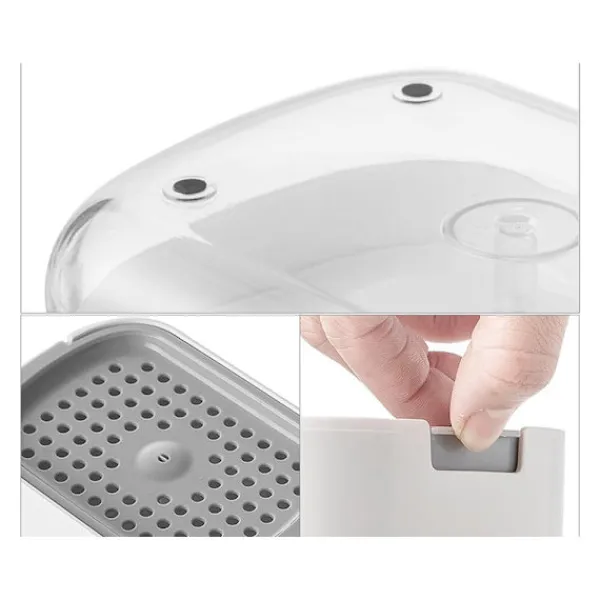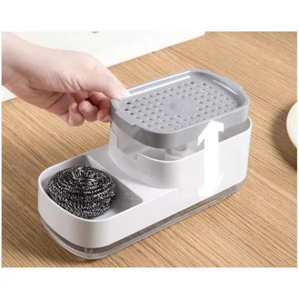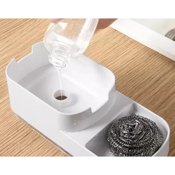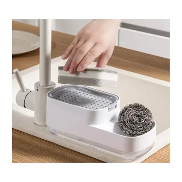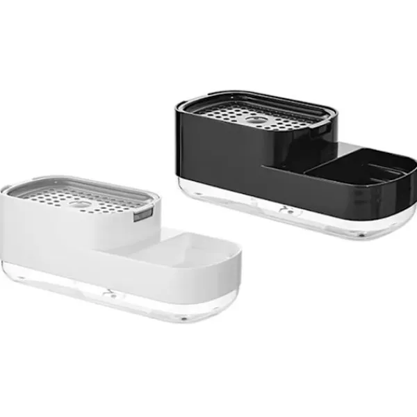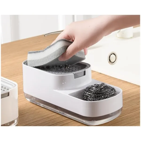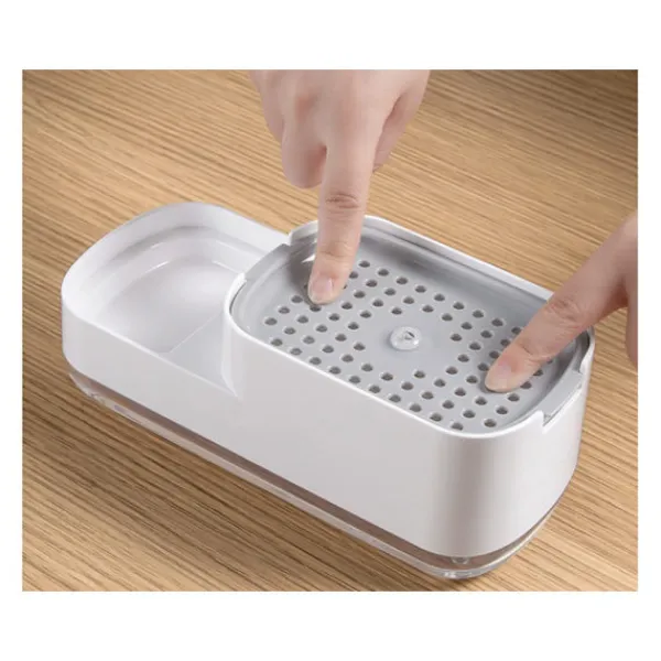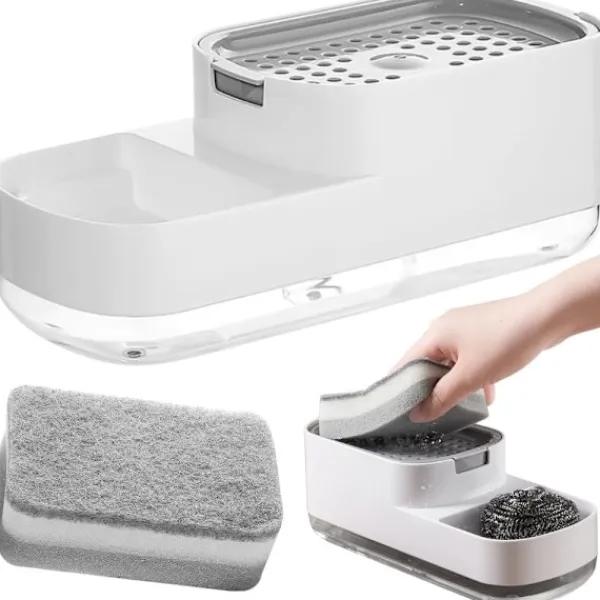Enheten är designad för daglig användning – det övre galleret dränerar överflödigt vatten från den blöta svampen till det nedre reservoaret, vilket gör att svampen torkar snabbare och förblir fräsch längre. Det extra utrymmet på sidorna är perfekt för en stålull eller en kastrullborste.