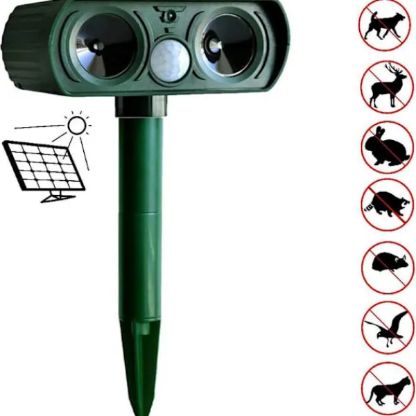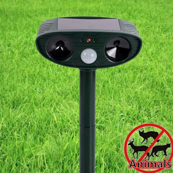 2. [Portabel design]: Eftersom djurskrämman har en portabel design kan den installeras i ditt hem, trädgård, gård eller var som helst. Denna produkt är en lågspänningsströmförsörjning med batteri. Denna produkt kan skrämma bort djur utan kemikalier, den avges endast med en ultraljudsfrekvens på 25 kHz som driver bort dem. Det kommer inte att skada människokroppen.