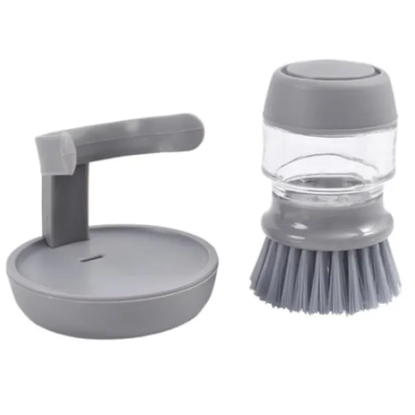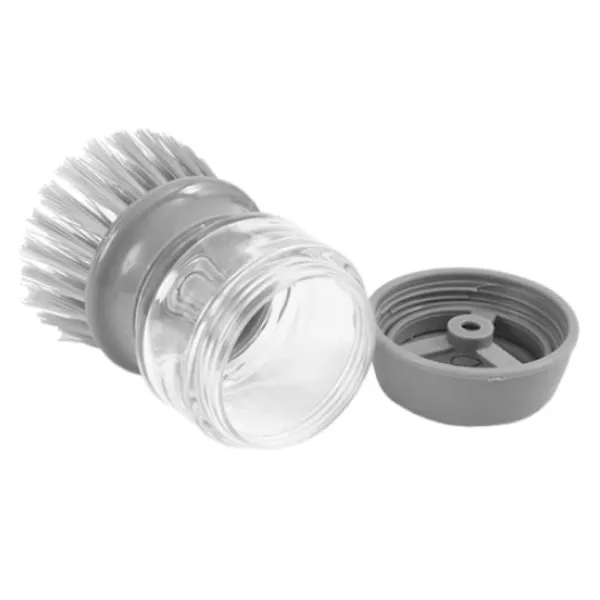 Att diska hemma blir mer effektivt med en diskborste med inbyggd behållare för diskmedel. Du fyller helt enkelt diskborstens behållare med diskmedel och när du trycker på en knapp på toppen av borsten pumpas diskmedlet genom borsten. När du är klar med rengöringen kan du placera diskborsten i den medföljande hållaren och tömma den. Det kvarvarande vattnet och diskmedlet rinner ner i en behållare på den nedre delen av gallret, som du sedan kan tömma.