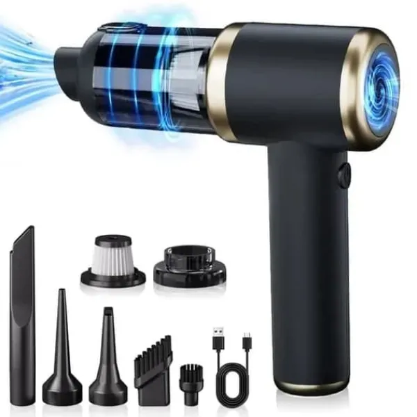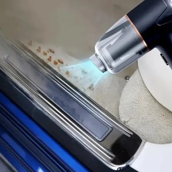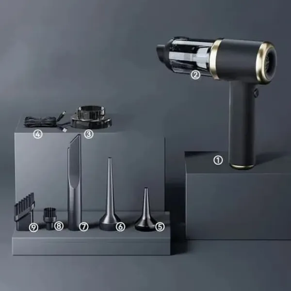 Utrustad med en höghastighetsmotor med upp till 5000PA sugkraft, som effektivt avlägsnar damm, hår, pappersskräp och småsten. Inkluderar smalt munstycke, kort blås-rör och multifunktionell borste för djupstädning av bilinteriörer, möbelhörn, tangentbord och soffor.