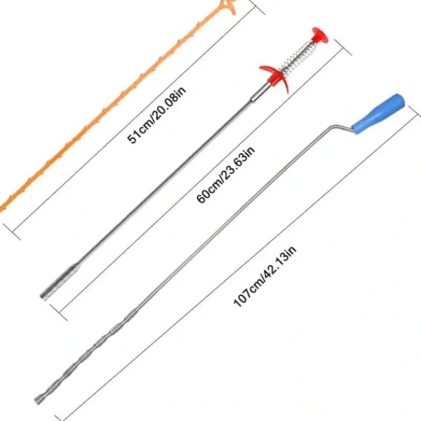 Utmärkt längd: mått (blått handtag, rostfri vattenorm: 107 cm, rött handtag, rostfri duschorm: 60 cm, plastborste med flera tänder: 51 cm), finns i tre storlekar, de är tillräckligt långa för att sätta in djupa rör, håll röret från öglan, ta enkelt bort pluggen.