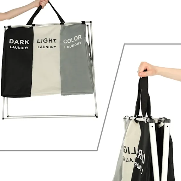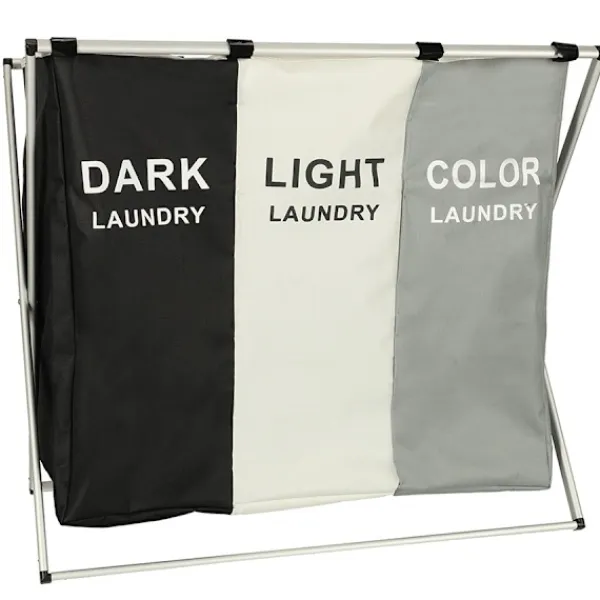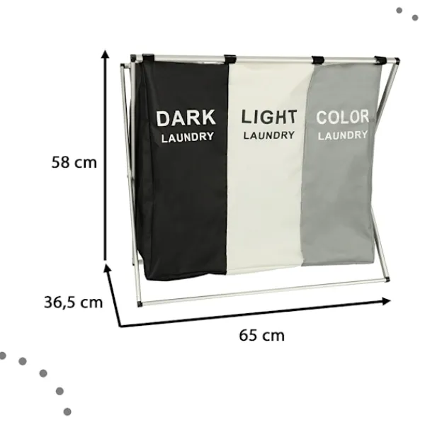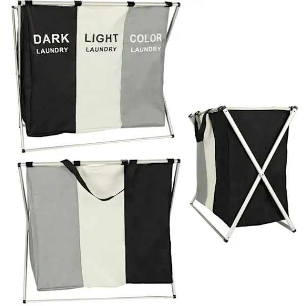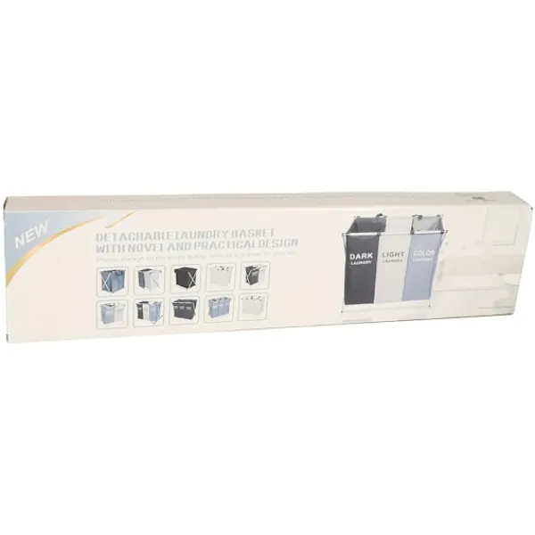 Denna praktiska tvättkorg med tre separata fack gör det enkelt att hålla ordning på smutstvätten. Varje fack är tydligt markerat för mörk, vit och färgad tvätt, vilket sparar tid och förenklar sorteringen redan innan maskinen startas. Den stora kapaciteten gör att korgen rymmer mycket kläder och passar lika bra i små hushåll som i större familjer.
