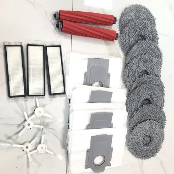Omfattande tillbehörssats: I detta set ingår huvudborstar, sidoborstar, dammsugarfilter, dammsugarpåsar och moppdynor.