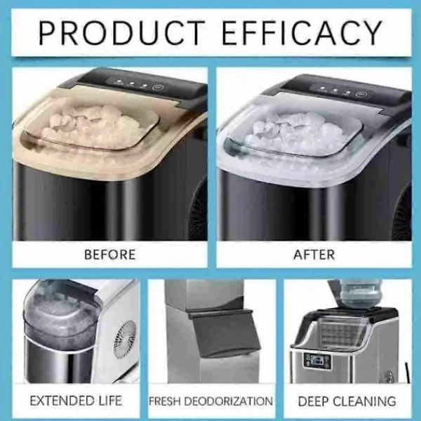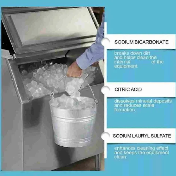 4. Förbättrad Iskvalitet för Bästa Smak: Vår avkalkare säkerställer att din ismaskin producerar kristallklar, ren is utan föroreningar eller bismaker. Efter rengöring är isen inte bara visuellt tilltalande utan smakar också bättre, vilket gör den idealisk för drycker, matpresentation och alla tillämpningar där iskvaliteten spelar roll. Förhöj upplevelsen för dina kunder eller familj med is som är fräsch och uppfriskande.
