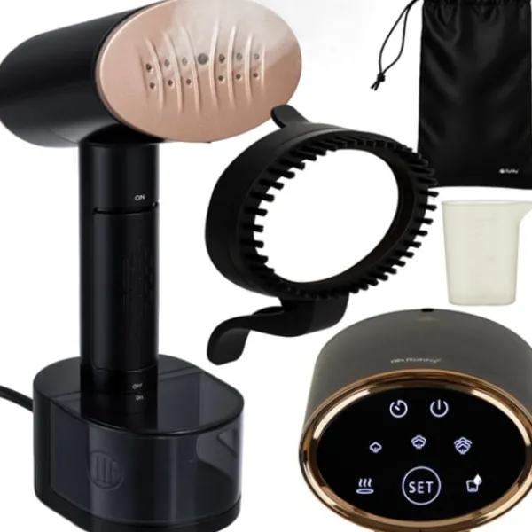 – tre ångnivåer (lågt, medel, högt) möjliggör perfekt anpassning till typ av material – från känslig siden till bomull och linne – ett praktiskt set med tillbehör – 2-i-1 byklämma och borste, vattnattsmätkopp och resefodral – gör ångaren ovärderlig hemma och när du reser