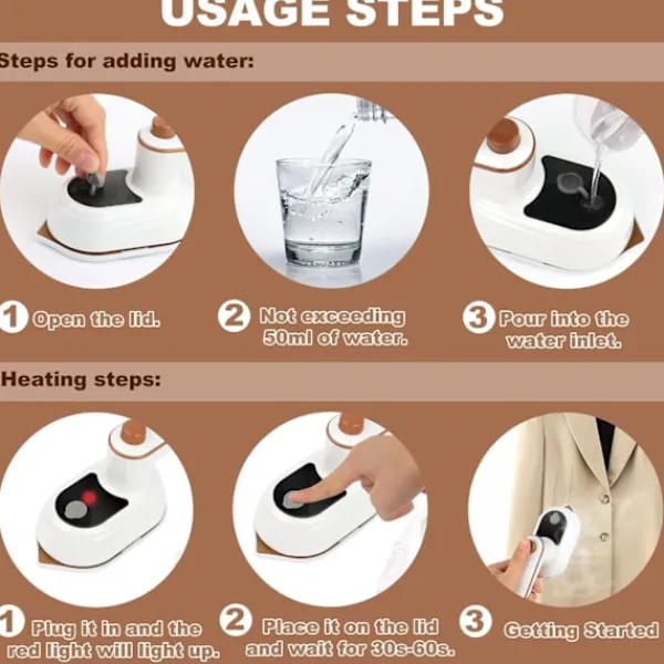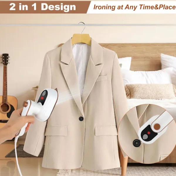 【Bärbart minidampstrykjärn】Det bärbara ångstrykjärnet har en hopfällbar handtagsdesign för bekväm förvaring och 180° flexibel växling mellan plattstrykning och hängande strykning. Kroppen är mycket liten och lätt, väger endast 0,67 pund och kan förvaras i en väska.