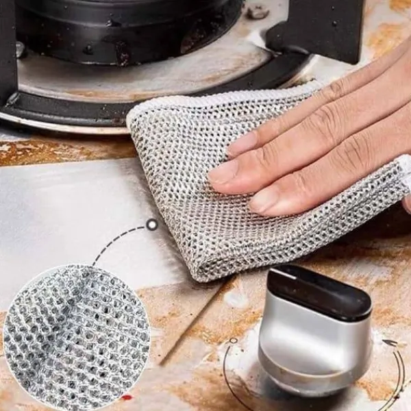 Diamantmönstrat ståltrådsnät tar bort fett, rost och envis smuts utan att skada ytor. Fungerar lika bra både vått (för skummande rengöring) och torrt (för grillar och spisar).