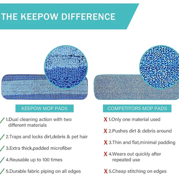 Hållbar Våra mopp-ersättningsdukar är extremt hållbara och återanvändbara, jämfört med andra mopp-pads, de kan tvättas och återanvändas hundratals gånger utan att oroa sig för krympning, sönderfall eller förlust av rengöringskraft
