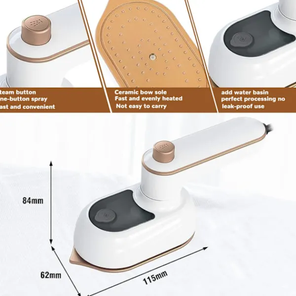 Material: Mini portabel strykmaskin tillverkad av PC, PBT, titanplatta, med vattentank och värmeisoleringsdyna, mycket platsbesparande, kan bäras med dig och enkelt förvaras i en resväska eller resväska, mycket lämplig för resor och semester.
