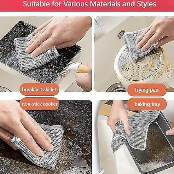 Lätt att Skölja och Återanvända: Multifunktionell repfri disktrasa av ståltråd. Till skillnad från många disktrasor av nät, där mat fastnar i nätet, är dessa superenkla att skölja ur och återanvända. Multifunktionella repfria skrubbplattor håller hundratals tvättar och är tillverkade med överlåsta kanter så att de inte faller isär i tvätten.
