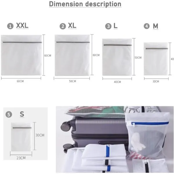 – Diverse Storlekar för Alla Behov: Med storlekar från S (23 x 30 cm) till XXL (60 x 60 cm), innehåller detta kit en påse för varje typ av tvättbehov, vilket gör det enkelt att hantera allt från delikat underkläder till större klädesplagg.