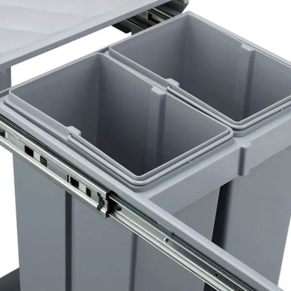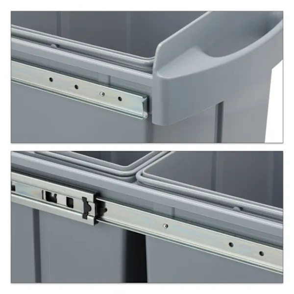 Det dolda avfallssorteringssystemet är utrustat med tre separata kärl, alla med praktiska handtag, vilket gör det enkelt att sortera och tömma avfallet. Oavsett om det är plast, papper eller organiskt avfall kan du nu hålla ditt kök rent och organiserat utan ansträngning. De smidigt löpande skenorna gör att kärlen kan dras ut hela vägen, vilket ger dig full åtkomst och gör sorteringen så bekväm som möjligt.