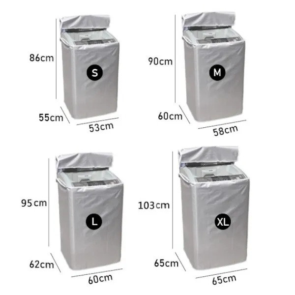 Detta tvättmaskinskydd finns i storlekarna S: 53x55x86 (cm), M: 58x60x90 (cm), L: 60x62x95 (cm), XL: 65x65x103 (cm). Denna storleksmodell passar de flesta tvättmaskiner.