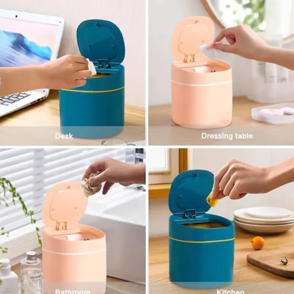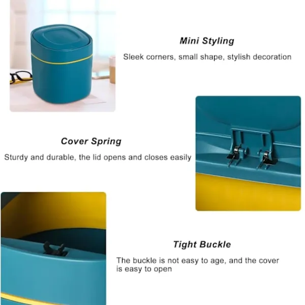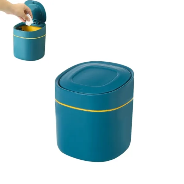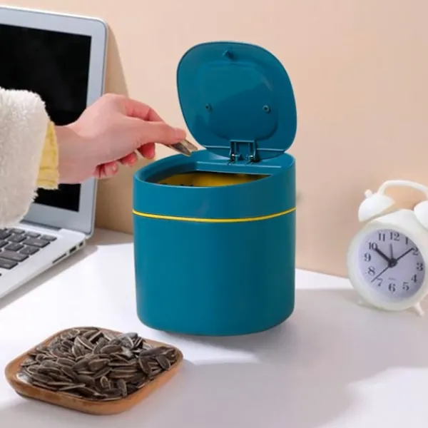 Bordsbehållare med Knapplock: Bordsbehållaren med lock har ett infällbart lock som kan öppnas eller stängas genom att trycka lätt på knappen. Locket är förseglat och läcker inte ut lukter. Den är lätt att använda och hygienisk, och är mycket praktisk.