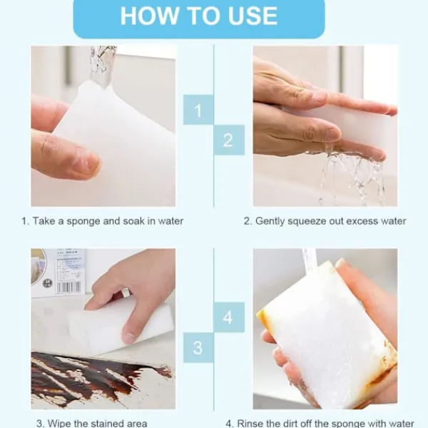 FLERÄNDAMÅL: Perfekt för kök, badrum, vägg, dörr, golv, badkar, skor, handfat och mer. Lätt att använda, blötlägg melaminsvampen i vatten, krama försiktigt ur vattnet och torka av det fläckade området, skölj den smutsiga svampen med rent vatten och tillsätt vatten efter användning.