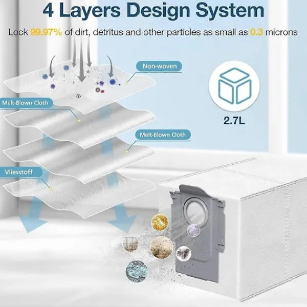 Effektiv dammhantering: Med en stor kapacitet på 2,7 liter fångar dessa påsar 99 % av smuts och skräp, vilket möjliggör längre perioder mellan byten. Det högeffektiva filtersystemet säkerställer att din dammsugare fungerar med maximal prestanda och upprätthåller ett rent och allergenfritt hem.