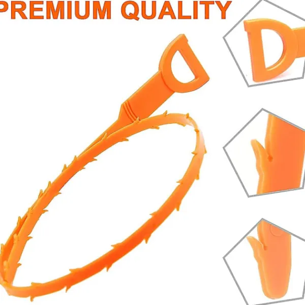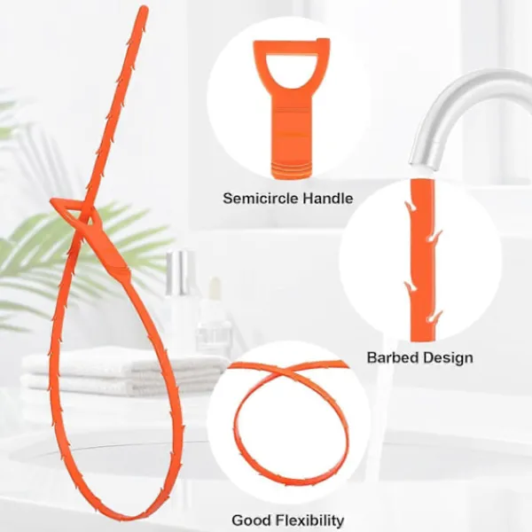 Produktförpackning och dimensioner: 3 orangefärgade 50 cm avloppsrensar kan fånga upp hår och blockeringar i en mängd olika avlopp.