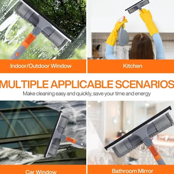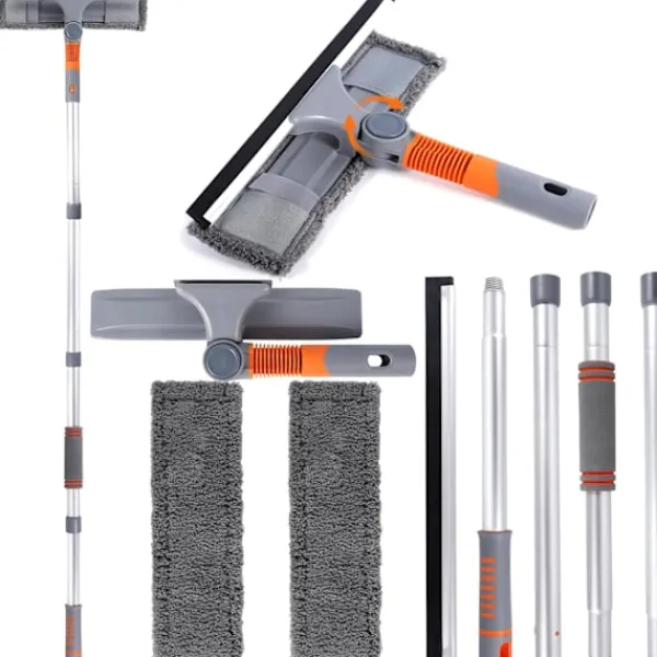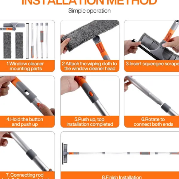 5-i-1 Fönsterrengöringsverktyg: Fönsterrengöringsverktyg med skrapa och utbytbar mikrofiberduk. Fönsterskrapan är tillverkad av naturligt mjukt gummi, som har bra tätning och seghet. Rengör enkelt fönster utan att lämna ränder och skyddar glaset från repor. Den mångsidiga fönsterskrapan har ett böjbart huvud som gör fönsterrengöringen snabbare och renare. Bekvämt Roterande Huvud: Fönsterrengöraren med teleskopstång med roterande handtag kan nå fönstret från olika vinklar. Tryck bara på en knapp för att vrida och låsa skraparhuvudet. Fönsterrengöraren kan lutas till valfri position inom 180 grader för att rengöra svåråtkomliga områden. Avtagbar Mikrofiberduk: Nylonspänne med hög viskositet, kan fästas, demonteras och installeras på borsthuvudet. Mycket bekvämt att byta ut och maskintvättbar.