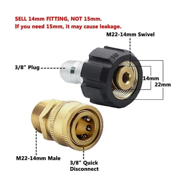 3/8 tum M22-koppling ansluter trycktvättspumpen. 3/4 tum trädgårdsslang Snabbkopplingssatser passar alla 3/4 tum standard trädgårdsslangar.