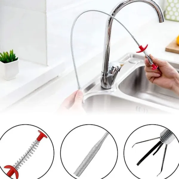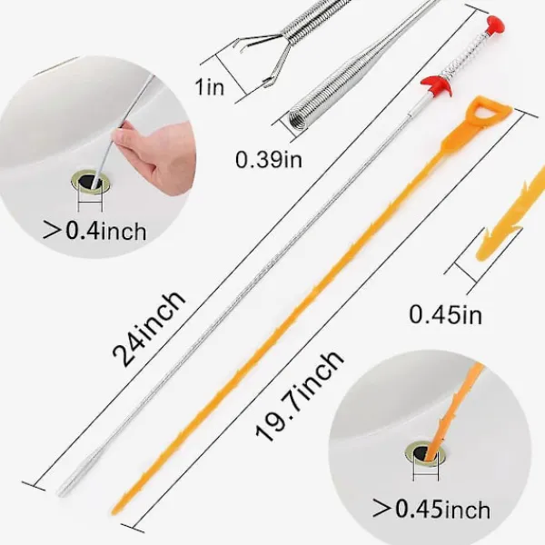 Rengöringsmedlet i rostfritt stål är cirka 24 tum långt, 0,9 tum brett, PP + rostfritt stålmaterial med god seghet, det finns en klo som kan greppa hår och andra blockeringar ordentligt. .