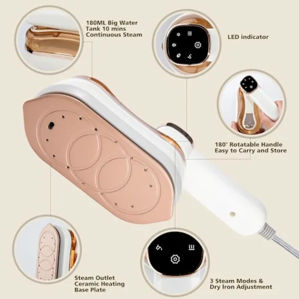 【Lätt att Använda】Den intelligenta LED-skärmen ersätter traditionella knappar, vilket möjliggör smidig strykning med ett enda tryck. Dra nytta av den premiumkeramiska sulan som används, mini ångstrykjärnet erbjuder snabb