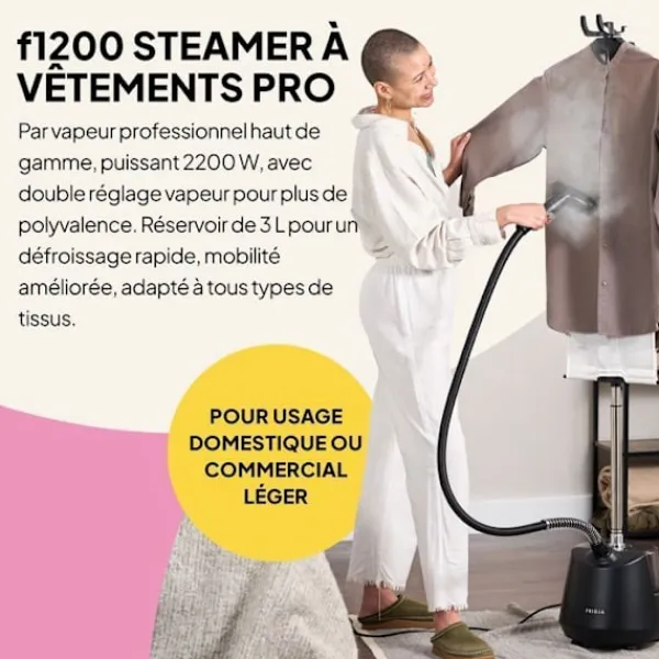 Med sina två ånginställningar anpassar sig Fridja f1200 perfekt till varje typ av tyg: från ömtålig silke till tjock bomull, utan risk för att skada fibrerna. Mångsidig, kan den också användas för att fräscha upp och desinficera gardiner, soffor och sängkläder, vilket eliminerar dofter och allergener för en mer hälsosam miljö.