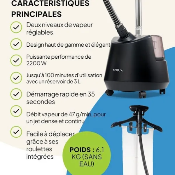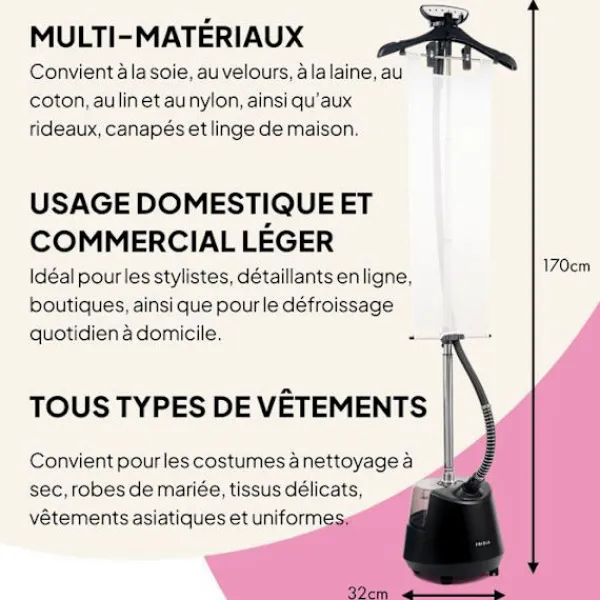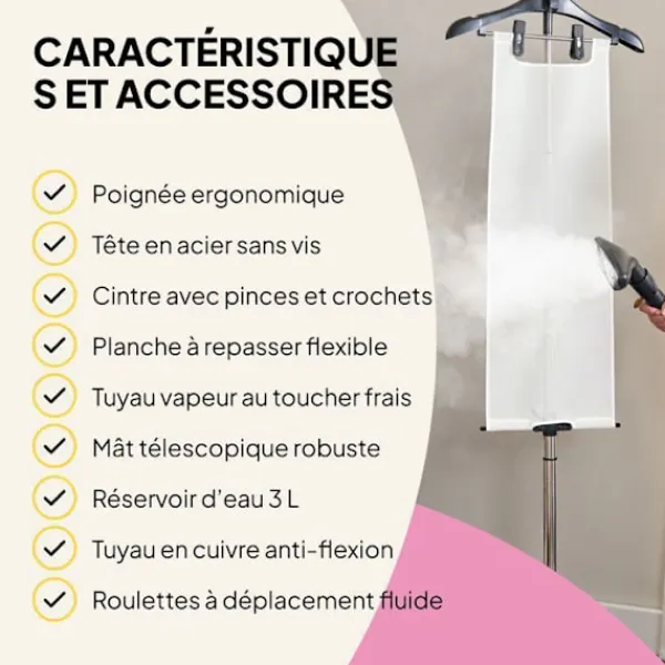 Levereras med ett komplett set av tillbehör – värmebeständigt handsk, borste för möbeltyger, justerbara hängare och flexibel strykbräda – vilket underlättar varje ångningssession. Slutligen garanterar dess ångslang med kall beröring säkerhet och komfort vid användning.