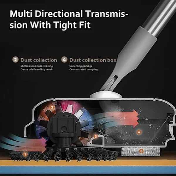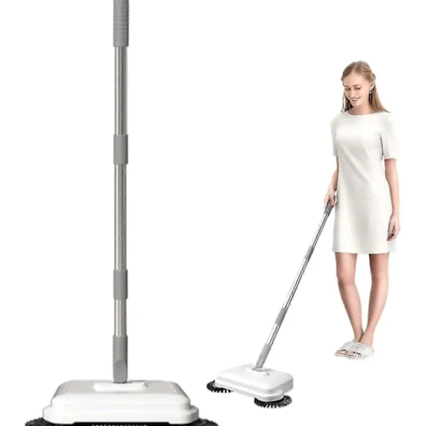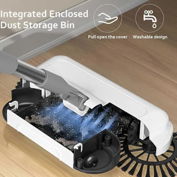 Två-i-ett: Golvsoparen har en två-i-ett-design för sopning och moppning. Den förlängda dubbelsidiga borsten kan rengöra nära hörnen; den mjuka, täta borstvalsen kan rengöra utan att missa något; fibervattenlåsande moppen kan absorbera vatten och ta bort fläckar. Den kan användas både vått och torrt, vilket gör rengöringen svår. Damm läcker inte.