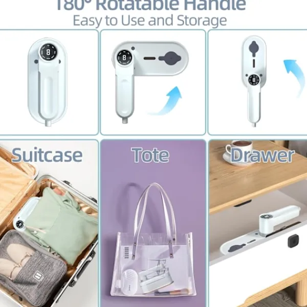 Bärbar Ångstrykjärn i Resestorlek: Den hopfällbara handtagsdesignen på det bärbara ångstrykjärnet för kläder ger bekvämlighet för din förvaring. Vårt ångstrykjärn levereras med en bärbar tygväska för enkel förvaring och bärbarhet. Den inkluderar även vattenkopptillbehör för bekväm vattenförsörjning. Du kan ta med den på semester, tillbaka till skolan, till college eller på resa och stryka när som helst, var som helst.