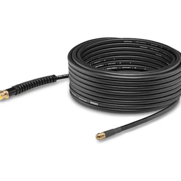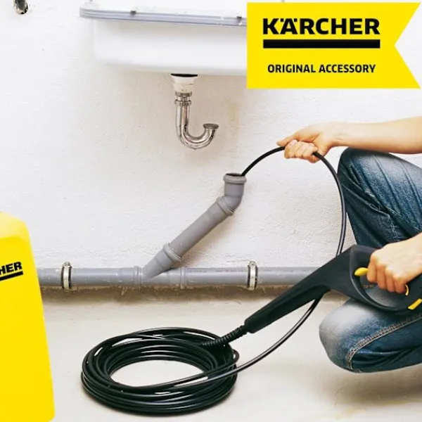 15 m slang, i tålig vävd tyg. Den bakre högtryckssprutan skjuter slangen genom avloppet för enkel rensning.