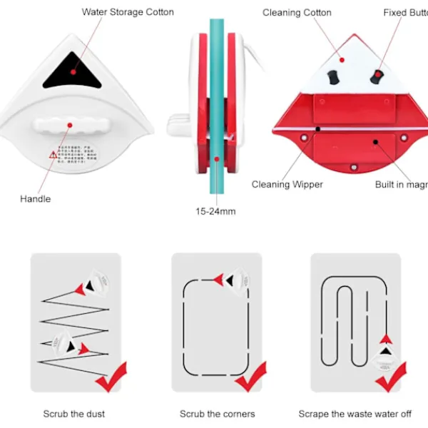 Effektivt dubbelsidigt magnetiskt rengöringsverktyg: Med en kraftfull dubbelsidig magnetisk design kan detta glasrengöringsverktyg rädda dig från att riskera att luta dig ut. Det är bättre än de tidigare vanliga glasrengöringsverktygen, rengör snabbare och är till och med på en högre nivå av glas Bra följeslagare.