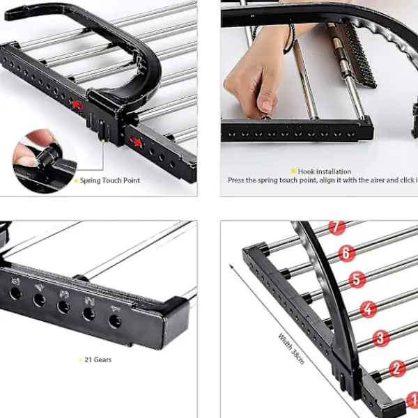 Flexibel användning: Med det justerbara upphängningssystemet fungerar torkstället på radiatorer, balkonger, fönster, duschar eller över dörrar.