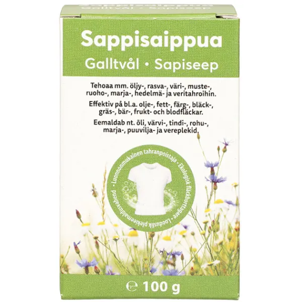 Tillverkad av naturliga ingredienser som natriumtvål, oxgalla och glycerin. Galltvålen är biologiskt nedbrytbar och belastar inte naturen.