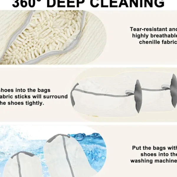 【360° OMFATTANDE RENGÖRING】 Mikrofiberdesignen säkerställer en 360° omslutande tvätt, vilket gör att vatten och tvättmedel kan tränga djupt in. Det andningsbara materialet säkerställer en grundlig, allsidig rengöring och skyddar dina skor från slitage och repor. Denna skotvättpåse förhindrar repor och håller träningsskor som nya