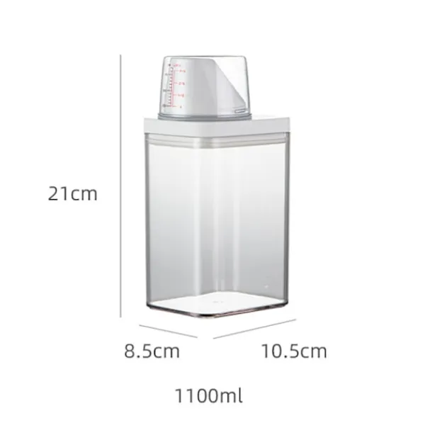 Denna tvättmedelsbehållare är perfekt för att hålla ditt tvättmedel organiserat och fräscht. Med en kapacitet på 1100 ml och en inbyggd måttskala underlättar den doseringen och minskar spill. Behållaren är tillverkad av hållbara material som AS, PP och TPR, vilket ger både lång livslängd och ett elegant utseende.