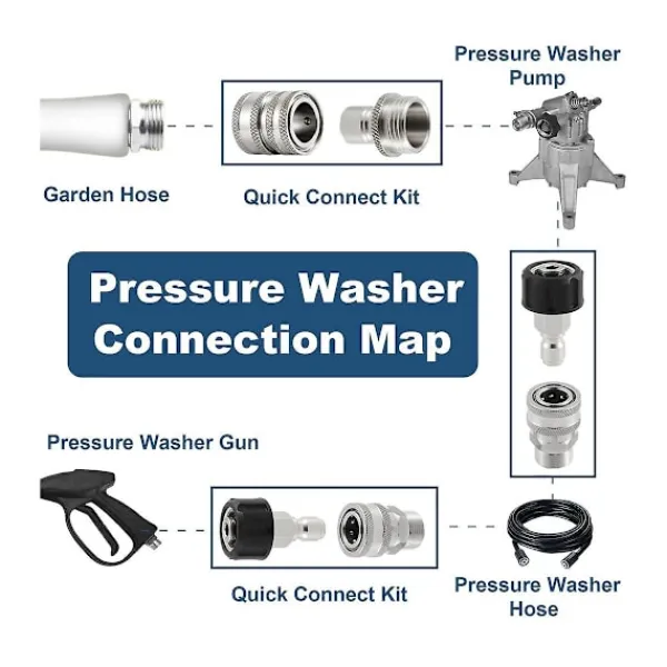 Adaptersatsen levereras med allt du behöver för att snabbt ansluta din högtryckstvätt och andra tillbehör utan att behöva dra åt slangen varje gång.