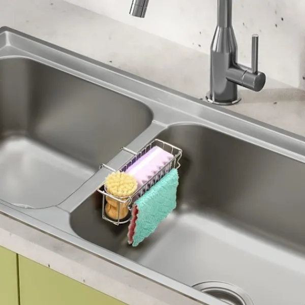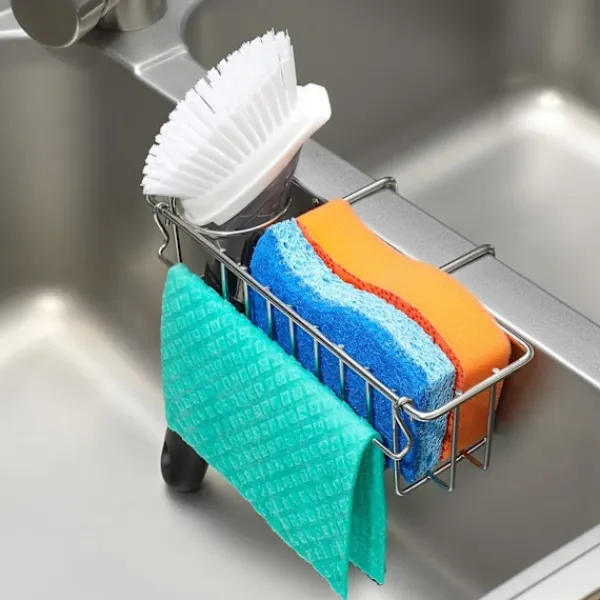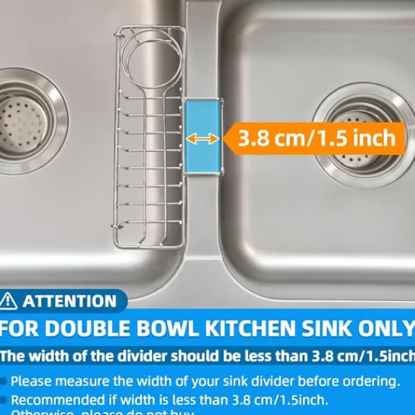 3 i 1 diskhoorganisatör – Denna diskhoorganisatör passar vanliga diskhoar (dubbla skålar med en bredd på mindre än 1,5 tum/3,8 cm). 3 i 1 diskhoorganisatören hjälper till att organisera och torka borstar, svampar, disktrasor och mer. Den är överlägsen svamphållare med sugkopp som kan falla av diskbänken