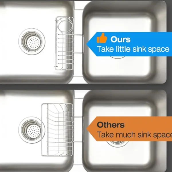 Liten storlek och sparar utrymme i diskbänken – 2,5 tum bred svamphållare tar upp lite utrymme i diskbänken. Den är överlägsen stora eller breda svamphållare som tar upp mycket utrymme i diskbänken och stör dig. Tänk noga på att den stora diskhoorganisatören tar upp mycket utrymme i diskbänken, och du kommer att slösa mycket utrymme i diskbänken och hindra normalt arbete som att diska och flaskor.