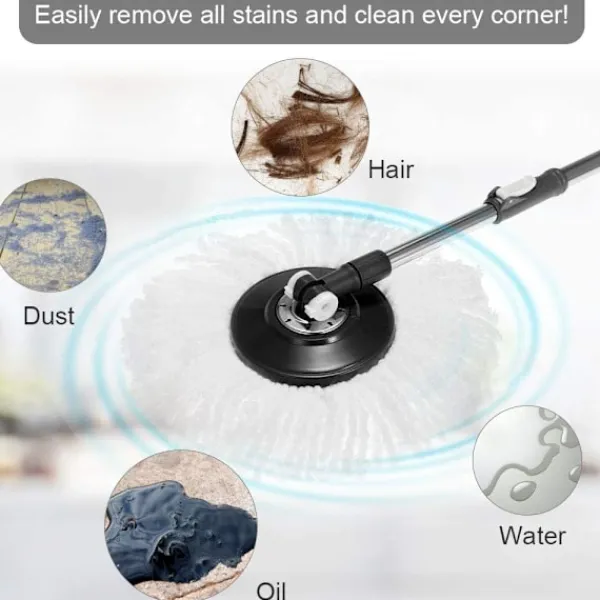 Perfekt rengöring: Mopphuvudet kan roteras 360° för att flexibelt rengöra varje hörn. Stark dekontamineringsförmåga, kan helt ta bort damm utan att lämna några vattenmärken