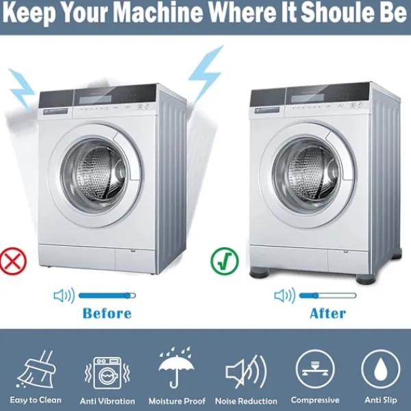BRED ANVÄNDNING: Stöt- och ljudreducerande stöd för tvättmaskin, antivibrationsgummikuddar kan användas inte bara för tvättmaskiner utan också för hushållsapparater, soffor, bordsben, stolsben, garderobsben, soffben. Det sparar utrymme. Löser