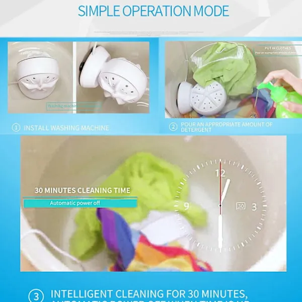Enkel manövrering. Stängs av automatiskt när tvätten är klar. Liten storlek och lätt vikt. Lätt att bära. Den tar bara lite plats. Bra val för resor eller affärsresa.
