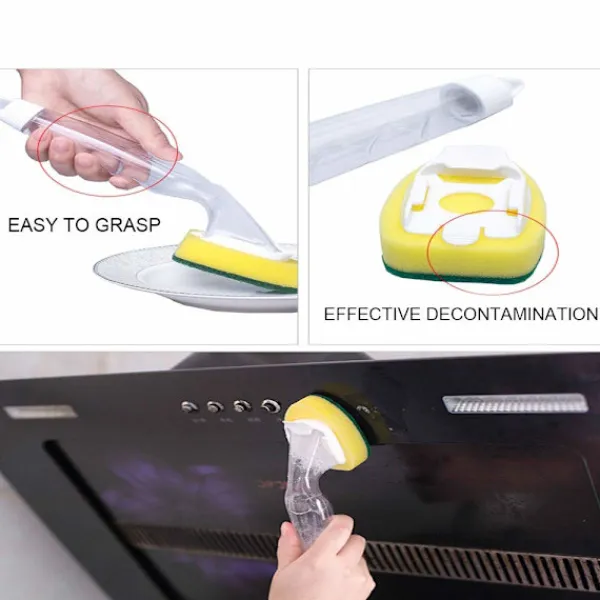【AUTOMATISK VÄTSKA】 Du kan hälla rengöringsvätskan i handtaget i förväg, och du behöver inte hälla rengöringsvätskan igen under rengöringsprocessen. Sedan rinner det ut genom svampen för att rengöra din disk. Det sparar ditt diskmedel och tiden för att skumma själv. Dessutom bör du notera att du måste kontrollera mängden rengöringsvätska som hälls i handtaget när du diskar för att undvika slöseri.