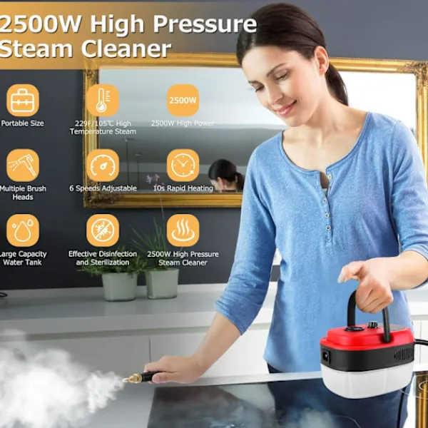【Kraftfull ångrengörare för hemmet】: 2500W ångrengöraren värms upp till 229°F (105°C) högtemperaturånga på 10 sekunder, rengör effektivt smuts, damm, fett etc. Gör ditt hem så gott som nytt.
