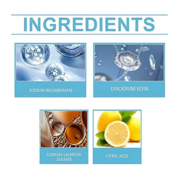 Ingredienser: NATRIUMBIKARBONAT CITRONSYRA NATRIUMLAURYLSULFAT DINATRIUMEDTA